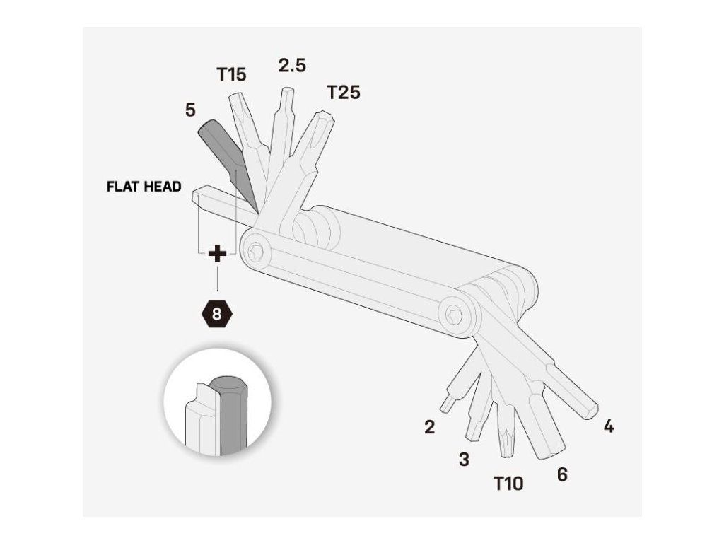 | TOOLS | 2 / 2.5 / 3 / 4 / 5 / 6 / 8 mm hex wrenches T10 / T15 / T25 Torx® wrench Flat head screwdriver |